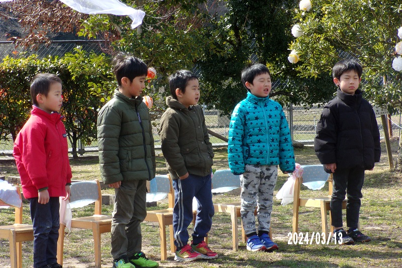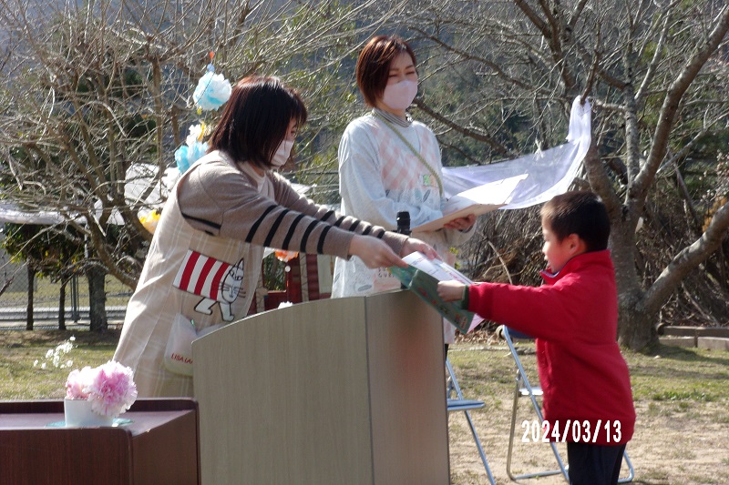 令和6年3月13日、東広島市立河内西保育所令和5年度卒園式予行演習が開催されました。卒園児5名(小田地区1名)は先生の呼名に元気よく返事をして、保育証書の授与を受けました。卒園児と在園児は力強い歌を歌ってお祝いしました。